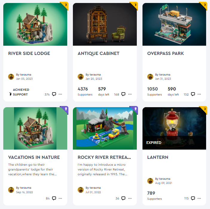 2月14日,terauma的投稿作品《河畔小屋》(RIVER SIDE LODGE)在乐高IDEAS平台获得10000票支持,成为入选2023年第一轮IDEAS审核的第26件作品,2023年第一轮审核的结果将在今年夏季公布。