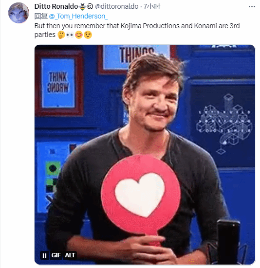 不过有网友在下方提醒:“但是别忘了小岛工作室和科乐美都是第三方哦”也配上了乔尔演员手持爱心的表情包。