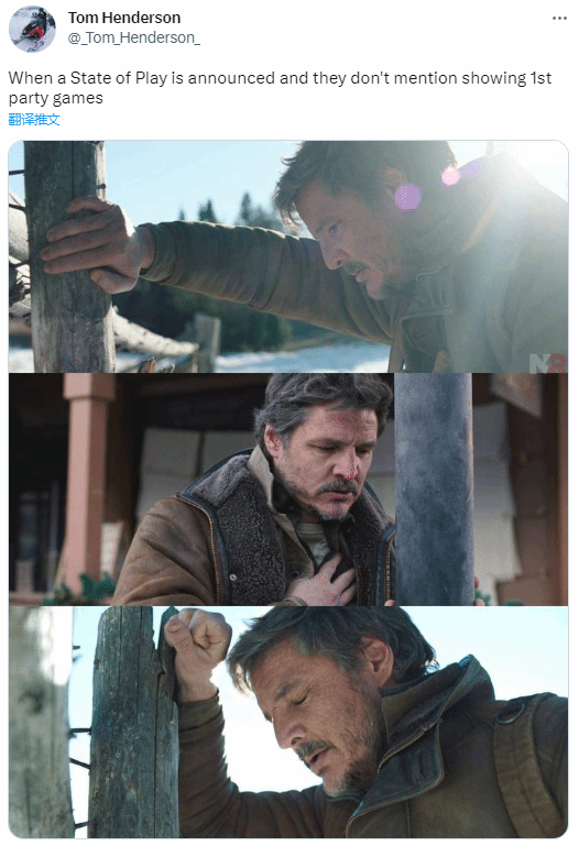 在公布完消息后,知名舅舅党Tom Henderson也表达了自己对发布会没有第一方游戏的感受:“当公布State of Play却没有提到要展示第一方游戏时”,并配上了HBO改编剧《最后生还者》中乔尔倚着树干心情低落叹息的图片。