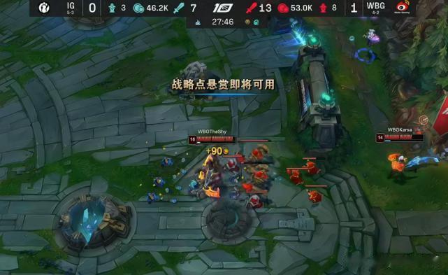 手握赛点,WBG小虎14分钟在中路控住IG野辅,配合卡萨和松少打出0换2,同时Theshy面对YSKM取得优势,WBG就此拉开差距。在WBG进攻中路的过程中,卡萨、小虎配合出现失误,卡萨蔚大招给错英雄,逆风的IG击杀WBG中野。