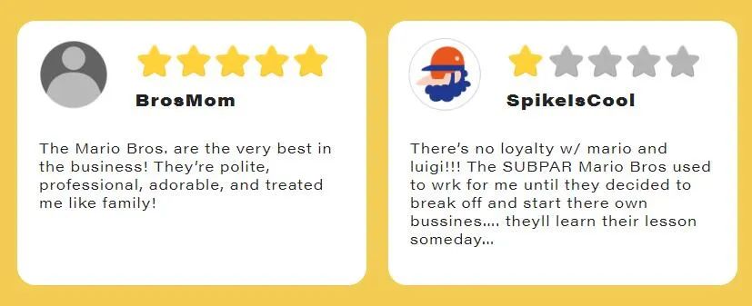 除了有这支预告的本体,这个网站上还有招聘启事,接线员、司机和会计都在招人;煞有介事搞了个用户评价界面,但5星好评都是“妈妈”刷的,1星差评看上去则来自瓦力欧和瓦路易基的同行挤兑。
