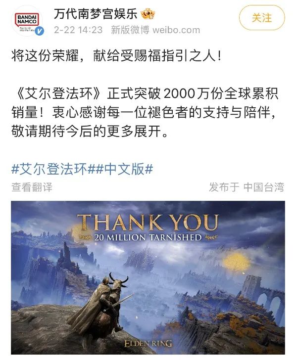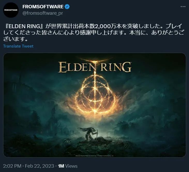 FromSoftware的官方推特宣布,《艾尔登法环》的全球销量突破了2000万份,并表达了对玩家们的感谢。