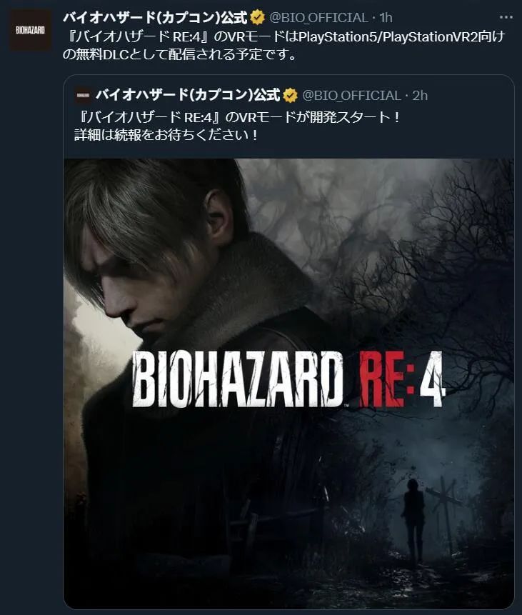 还未发售的《生化危机4:重制版》也在下午发文称,游戏的VR模式正在开发中,之后将作为免费DLC发放给PS5版本的玩家。