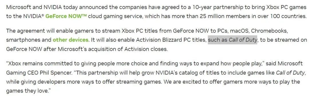 此举和昨天的合约类似,除了平台间的合作,也是微软在动视暴雪收购案上向外界传递的又一个信号。所以在双方的合作公告中,都特意提到一旦收购完成,英伟达云游戏平台上的玩家将可以玩到动视暴雪出品的PC游戏,并且仍然单独戳了戳《使命召唤》。