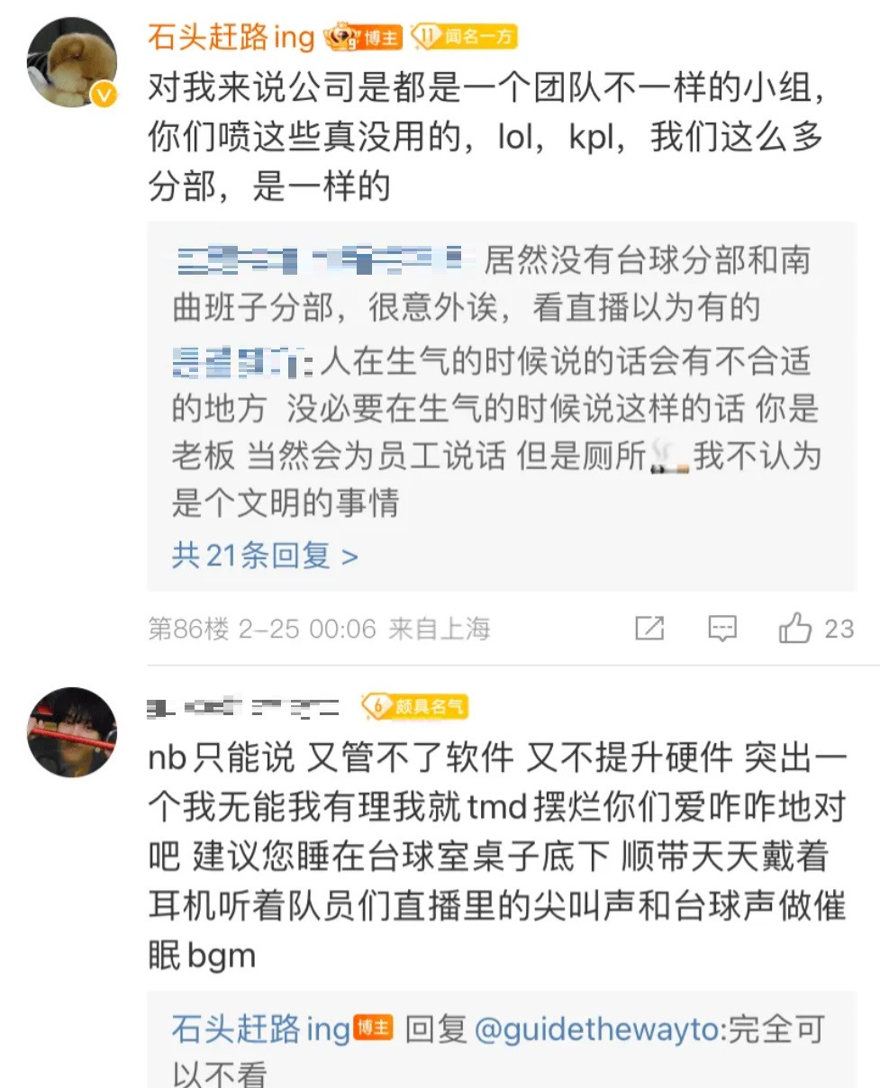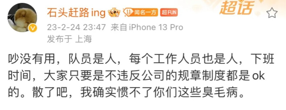 本来这个事情只是局限于粉丝之间的讨论,没想到WBG的经理发现之后直接下场开始和粉丝对线了,最开始经理是发布了一条微博,内容简单来说就是告诉粉丝,吵没有用,工作人员也是人,下班之后只要不违反公司规定都是OK的。