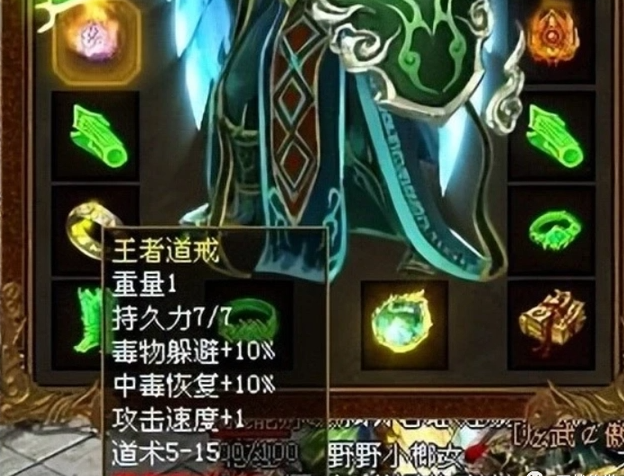 当年大名鼎鼎的天才道士就有一枚毒物躲避+10%、中毒恢复+10、攻速+1、道术5-15的极品王者道戒,也是凭借着这枚戒指的攻防一体的逆天属性创造了一人守沙城的奇迹。