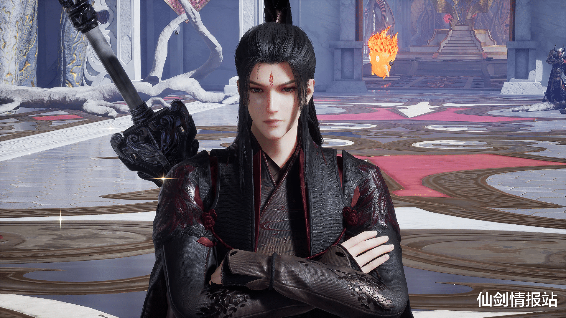 当修吾穿上这样一身时装,行走在天魔国丝毫没有违和感。甚至感觉就像是天魔国的王子回到了自己的家一样。这套时装应该是参考第一套时装改的,衣服整体换了个配色,白金变成了黑红。从截图上可以看到,红色在黑色的衬托下,一些衣服上的细节变得更加明显和突出了。不知道大家有没有发现,主角头顶的金色叶子变成了红色叶子?