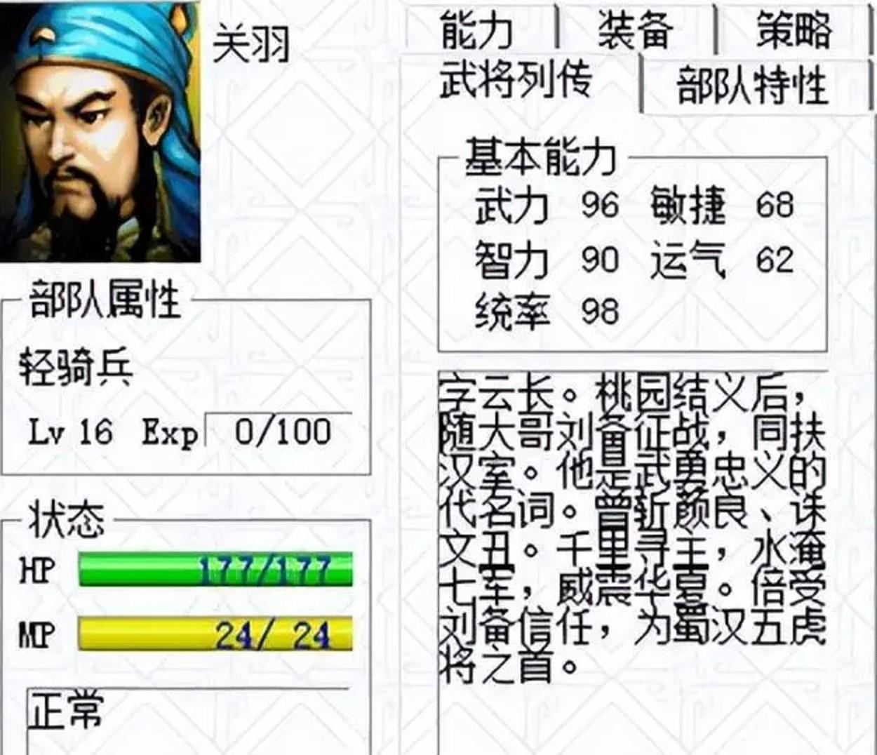关羽的五维属性分别是武力96,敏捷68,智力90,运气62,统率98。乍看之下武力值还算比较亮眼,然而敏捷和运气两项居然只有60多点,这会严重影响连击和暴击的几率。
