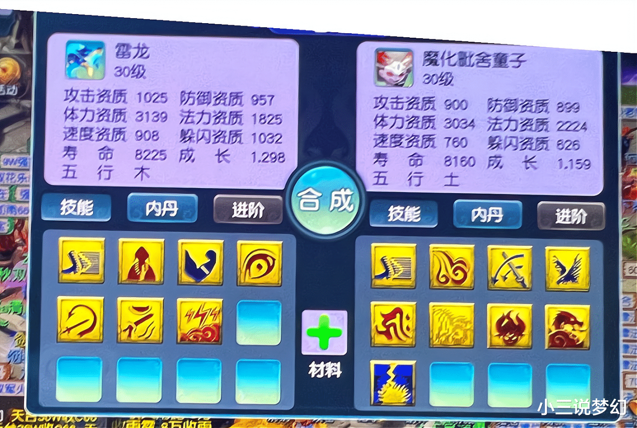 这位玩家所使用的是1只七个技能拥有着出其不意的雷龙和一只9个技能拥有着风起龙游和须弥真言两个特殊技能的魔化毗舍童子,上面的这组炼妖在最极限的情况下能够获得一只16个技能的雷龙。