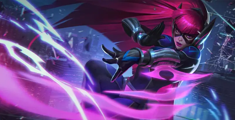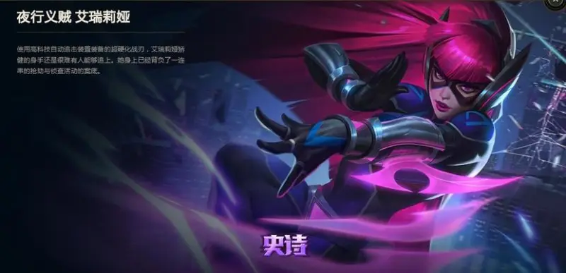 该皮肤的原画我认为相当出彩,游戏内的表现只能说聊胜于无。这位亦正亦邪的美貌女贼与DC旗下的猫女非常合拍,姣好的脸庞让我无法对她有什么厌恶之感。