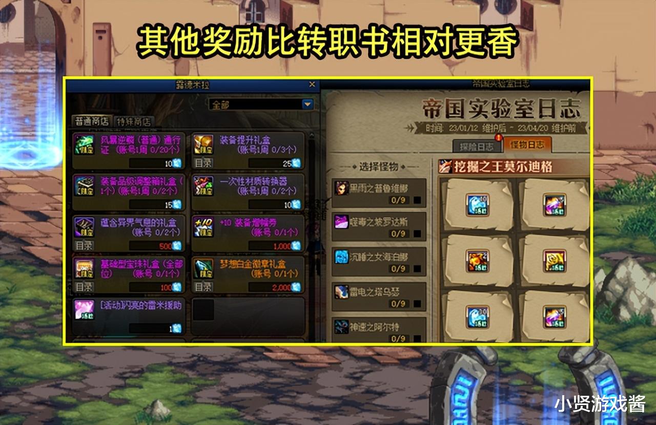 首先,第一个原因是为了奖励,帝国实验室不止有转职书这个给力的道具,同时还有其他给力的道具,例如+10增幅券、梦想白金徽章礼盒,以及完成怪物记录获得的2张传说卡片、2个灿烂徽章自选礼盒和黄金书。转职书虽说对于一些玩家来说极品道具,但是对于不需要的玩家来说就是垃圾,相比于转职书,一些玩家更希望送多一本+10增幅券,或者多一本黄金书。