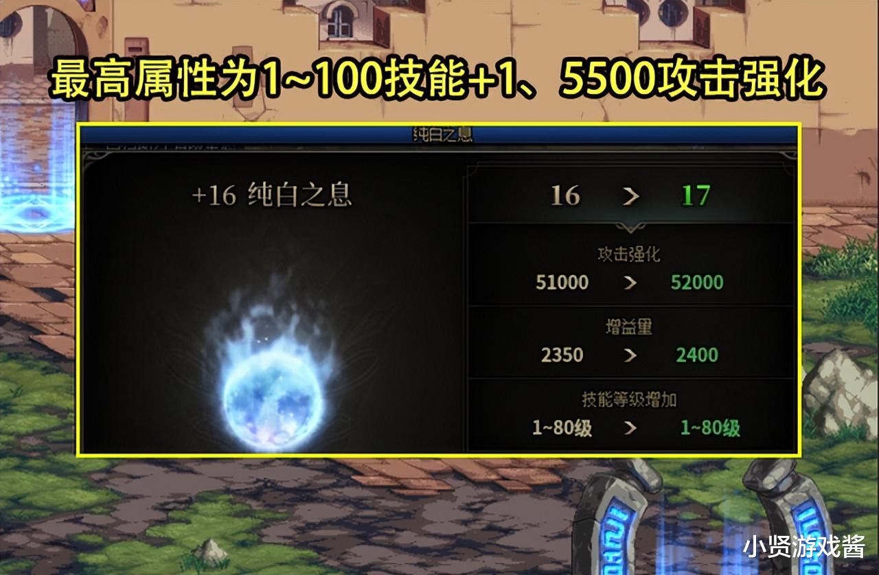 第二个原因是为了纯白之息碎片材料,在每次通关普通地下城之后,都会获得1个纯白之息材料,材料可以对纯白之息进行强化,强化后可以为自己增加buff,最高强化20级后,可以对1~100级技能+1、以及增加55000攻击强化。
