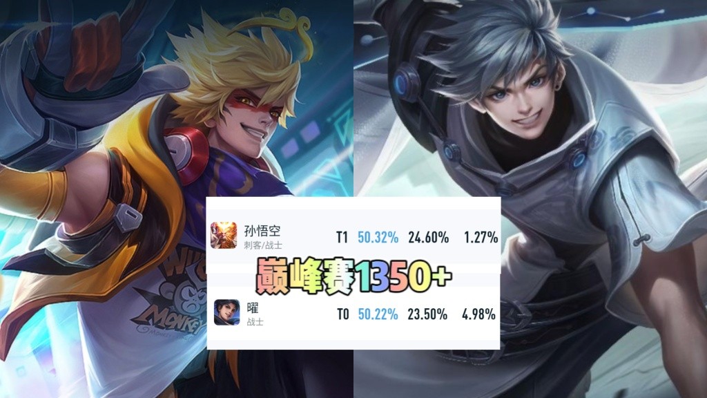 就巅峰赛1350的数据而言,孙悟空胜率为50.32%,出场率24.6%;曜的胜率50.22%,出场率23.5%。可以看到,曜的出场率明显上涨,无论是胜率还是出场率,两个英雄的数据基本一致,这说明两个英雄的强度在这个分段也比较一致。