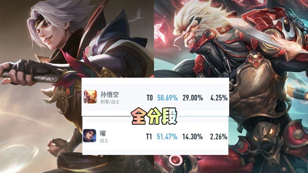 就全分段数据而言,孙悟空胜率为50.69%,出场率29%;曜的胜率51.47%,出场率14.3%。可以看出,虽然猴子胜率低一点,但结合高于曜的两倍出场率来看,猴子在全分段的强度是要高于曜的,主要是因为中低分段的情况下,爆发确实是更吃香的一种打法。