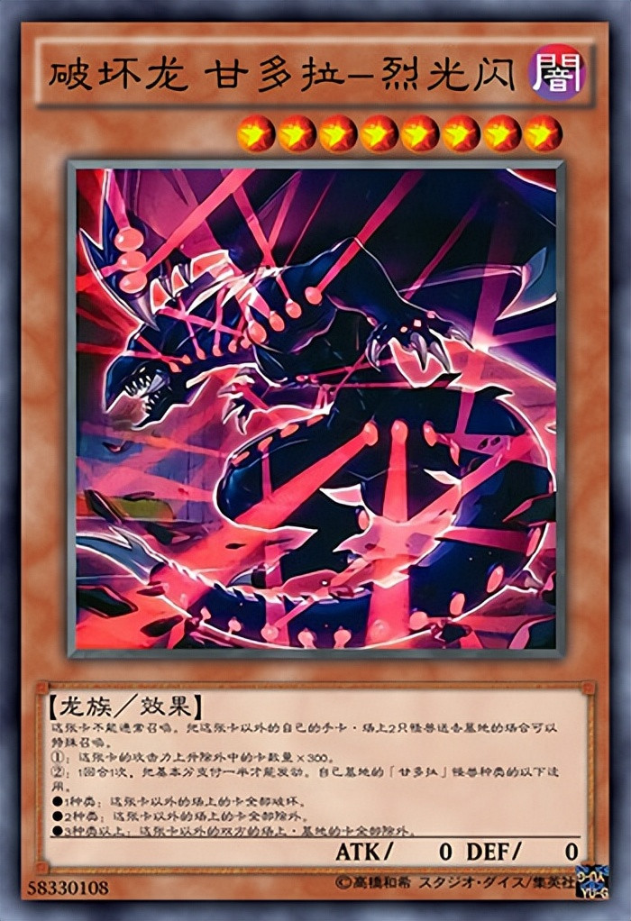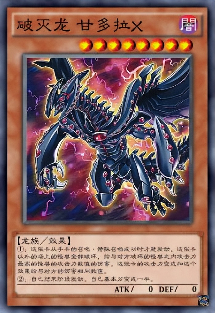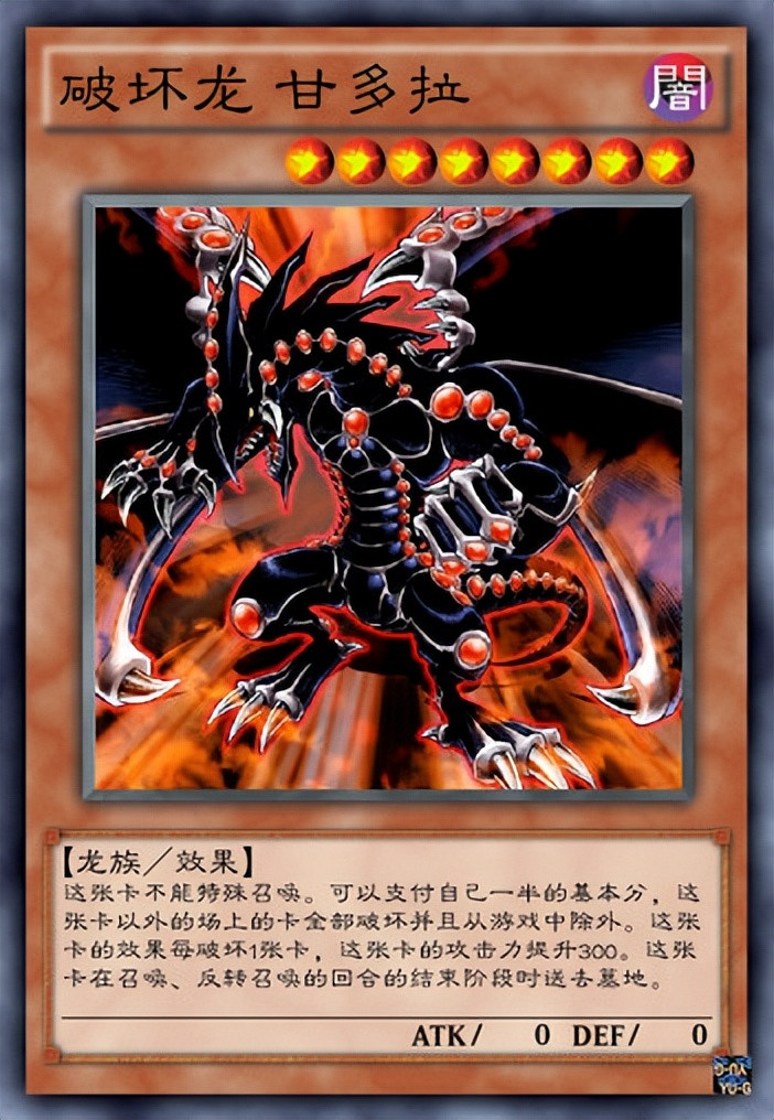 说到“破坏龙”当然不少得“破坏龙.甘多拉”,这条漆黑之龙,全身布满破坏的能量光球,发动破坏之力是更是“夺目耀眼”,这是在《游戏王DM》中登场的怪兽,是“表游戏”的王牌。其清场能力十分恐怖,可以说是片甲不留,也是逆转战局的最好保证,“表游戏”凭借这只怪兽打败了“貘良”的黑暗人格,一战成名。