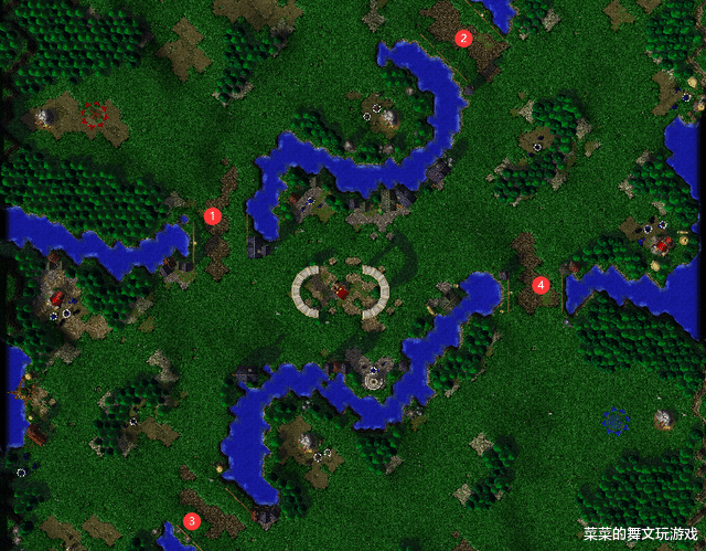 从上图中我们不难看出,双方互相进攻时,地面路线都只有2个狭小路口。在双方都没有空中战力的前中期,人族控图难度会非常之低。简单来说,人族出生在4点钟位置,只需要在3、4两个位置各放一个民房,就能保证在亡灵开启进攻之前发现意图;同样的出生在10点钟点位,也只需要在1、2两个位置各放置一个民房即可。